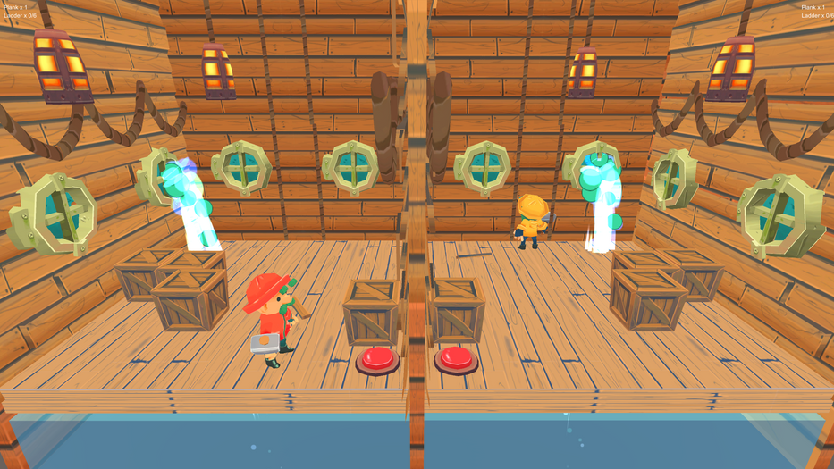 Under Pressure is a local multiplayer game set on a sinking ship. Players need to repair broken windows to slow down the rising water and gather falling planks to build a rope ladder to get out of the room. There is also a button they can use to break a window in the other player's room, sabotaging their progress.
